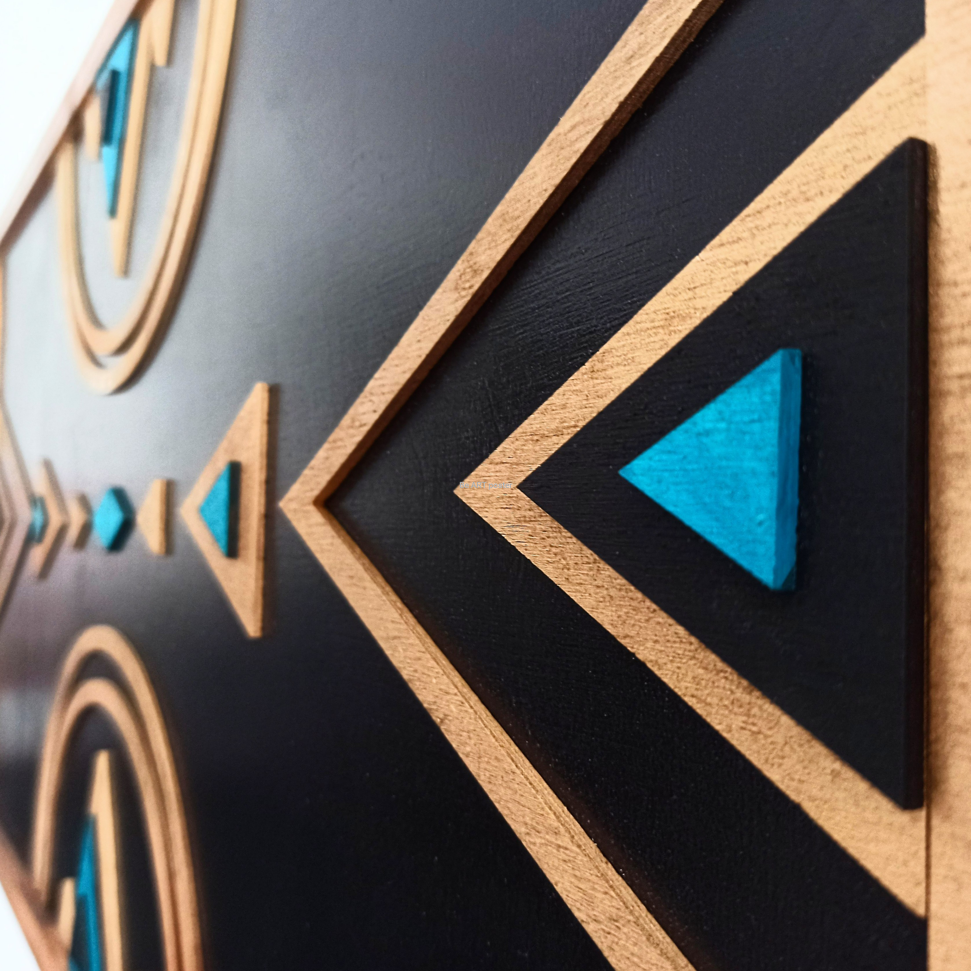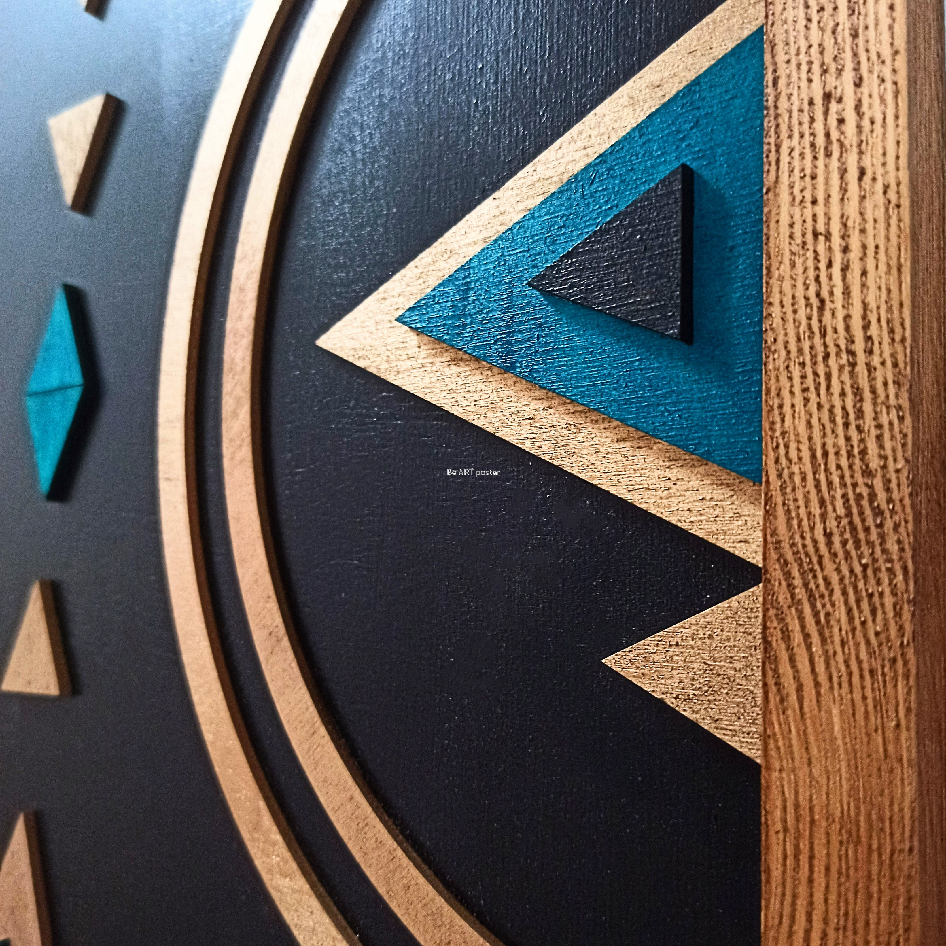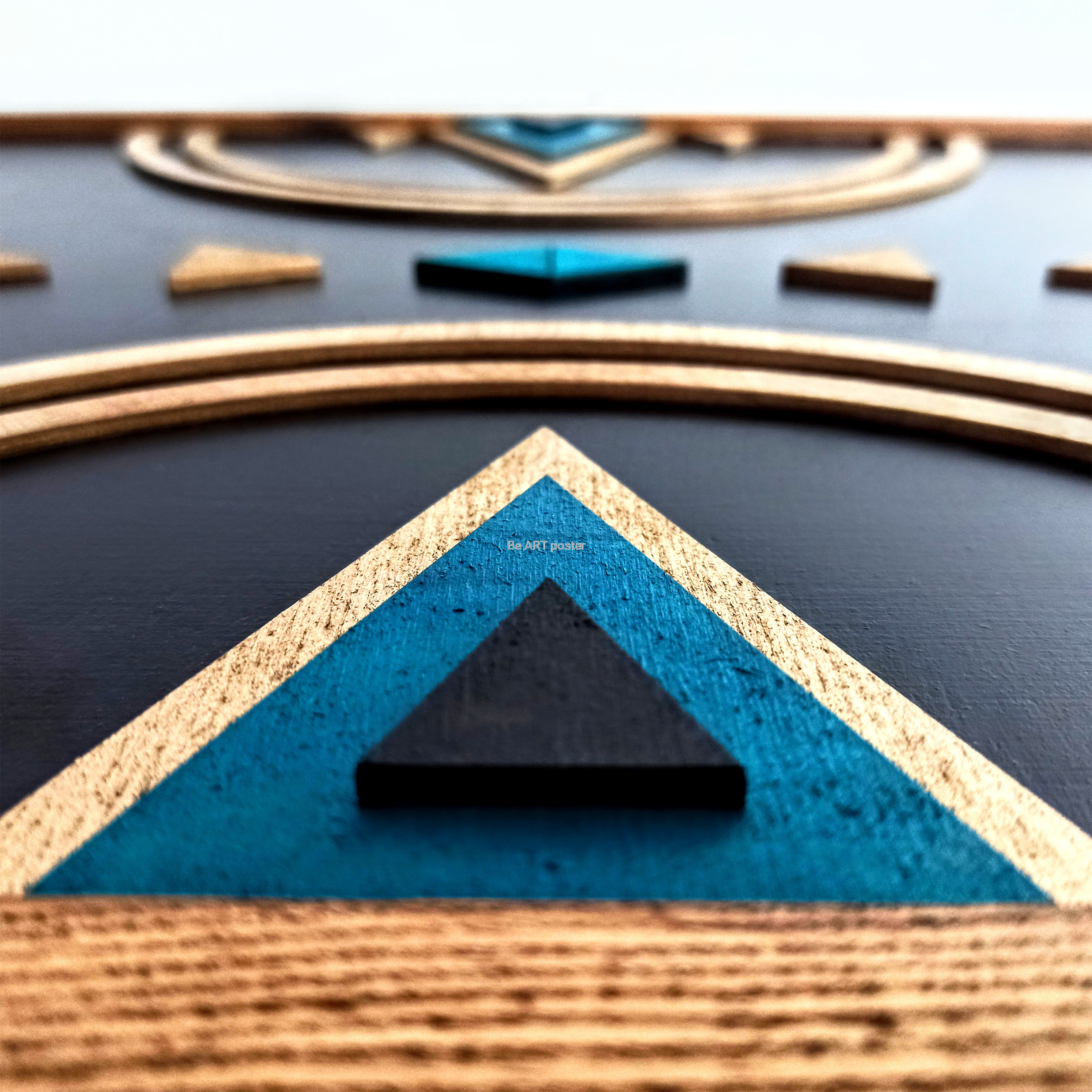 Inspiracja boho chic i geometrią. Obraz pokryty bejcą podkreślającą słoje z dodatkiem koloru złotego, czarnego i turkusu.