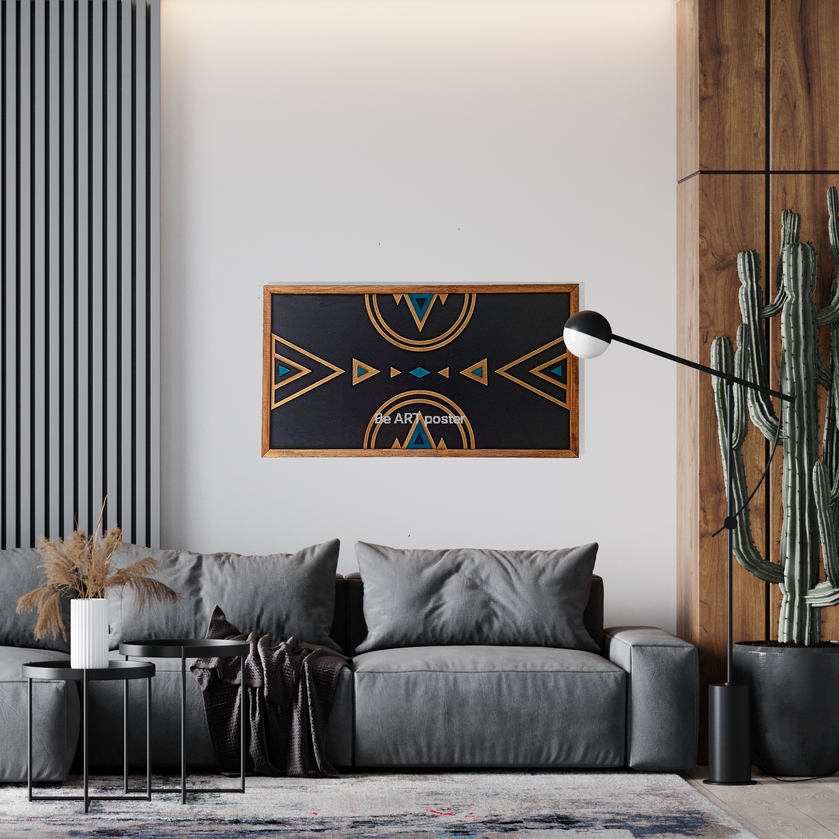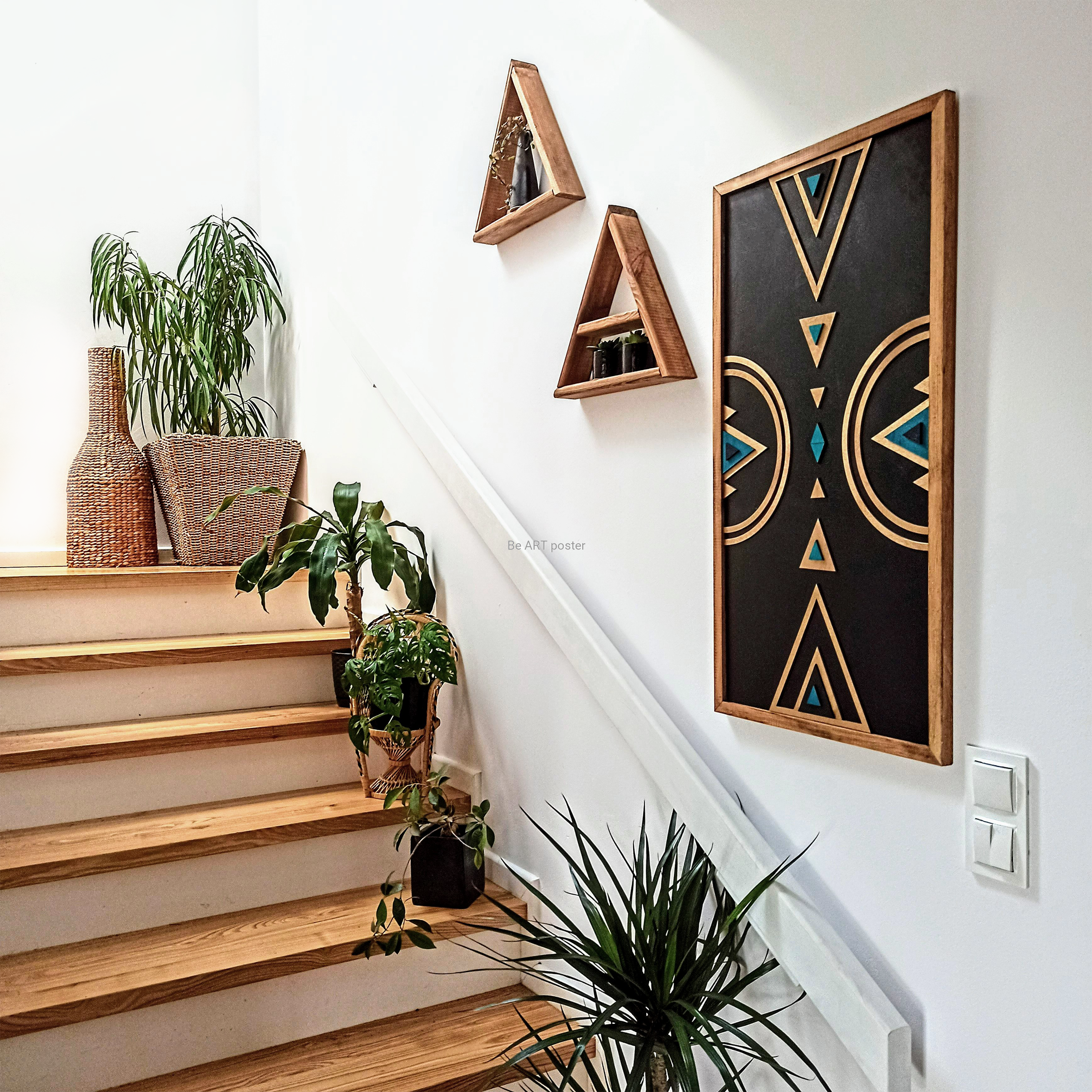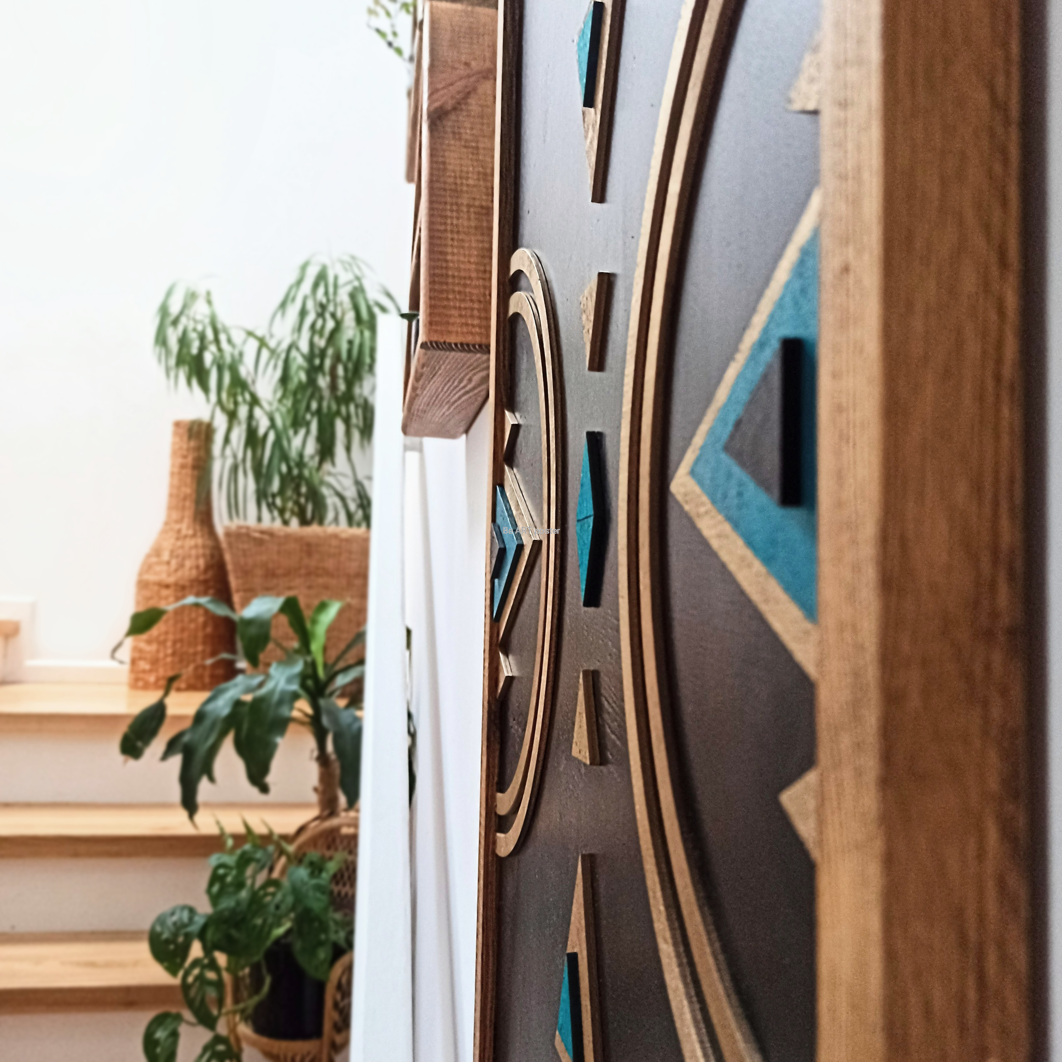 Inspiracja boho chic i geometrią. Obraz pokryty bejcą podkreślającą słoje z dodatkiem koloru złotego, czarnego i turkusu.