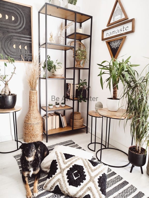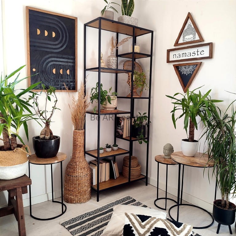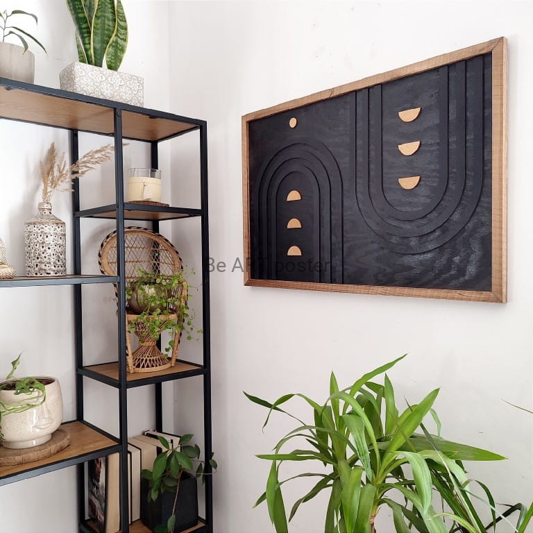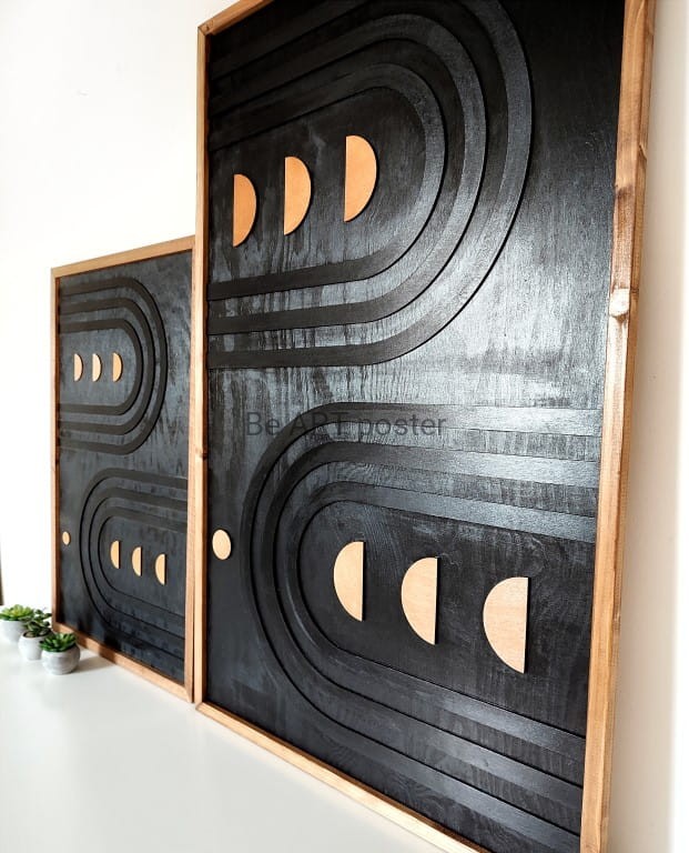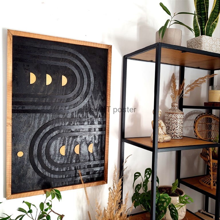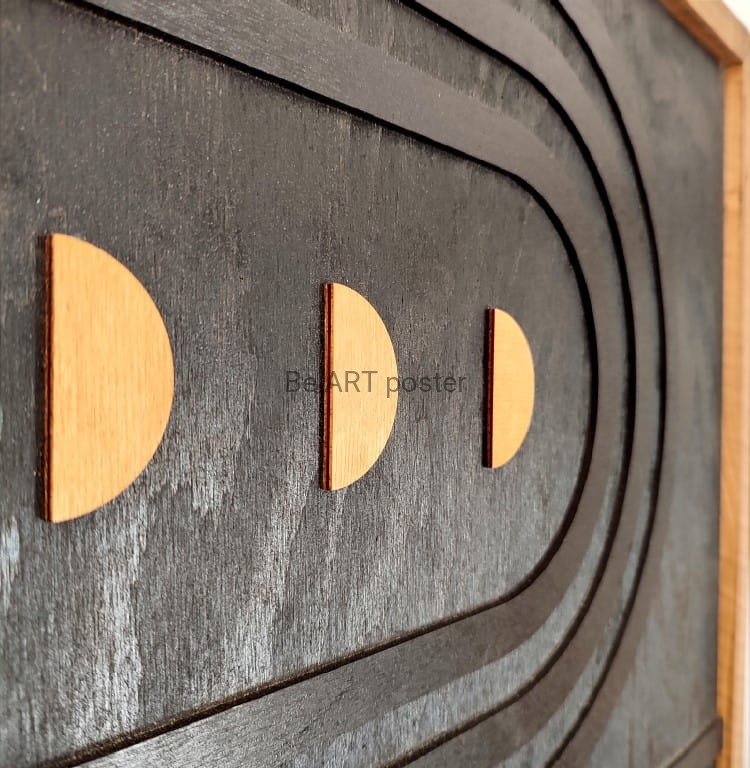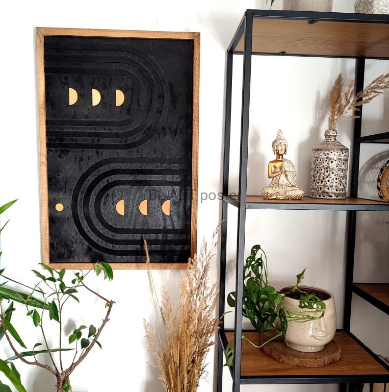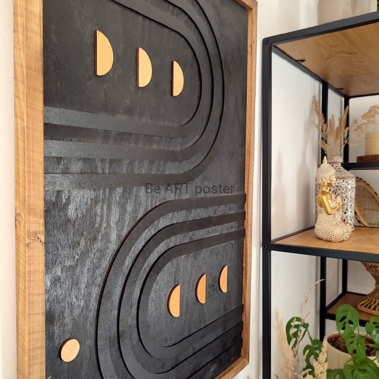 Inspiracja boho chic i geometrią. Obraz pokryty bejcą podkreślającą słoje.