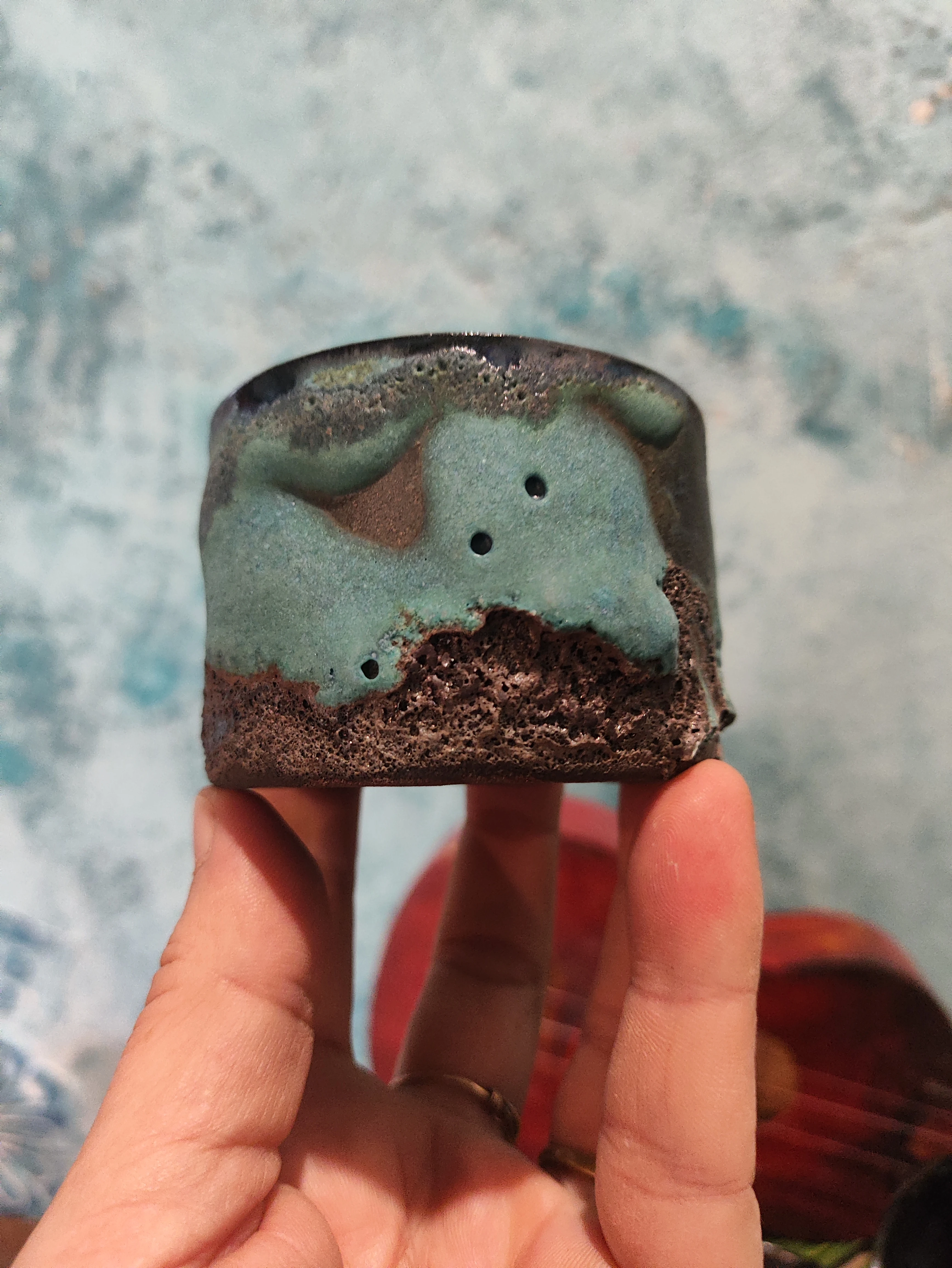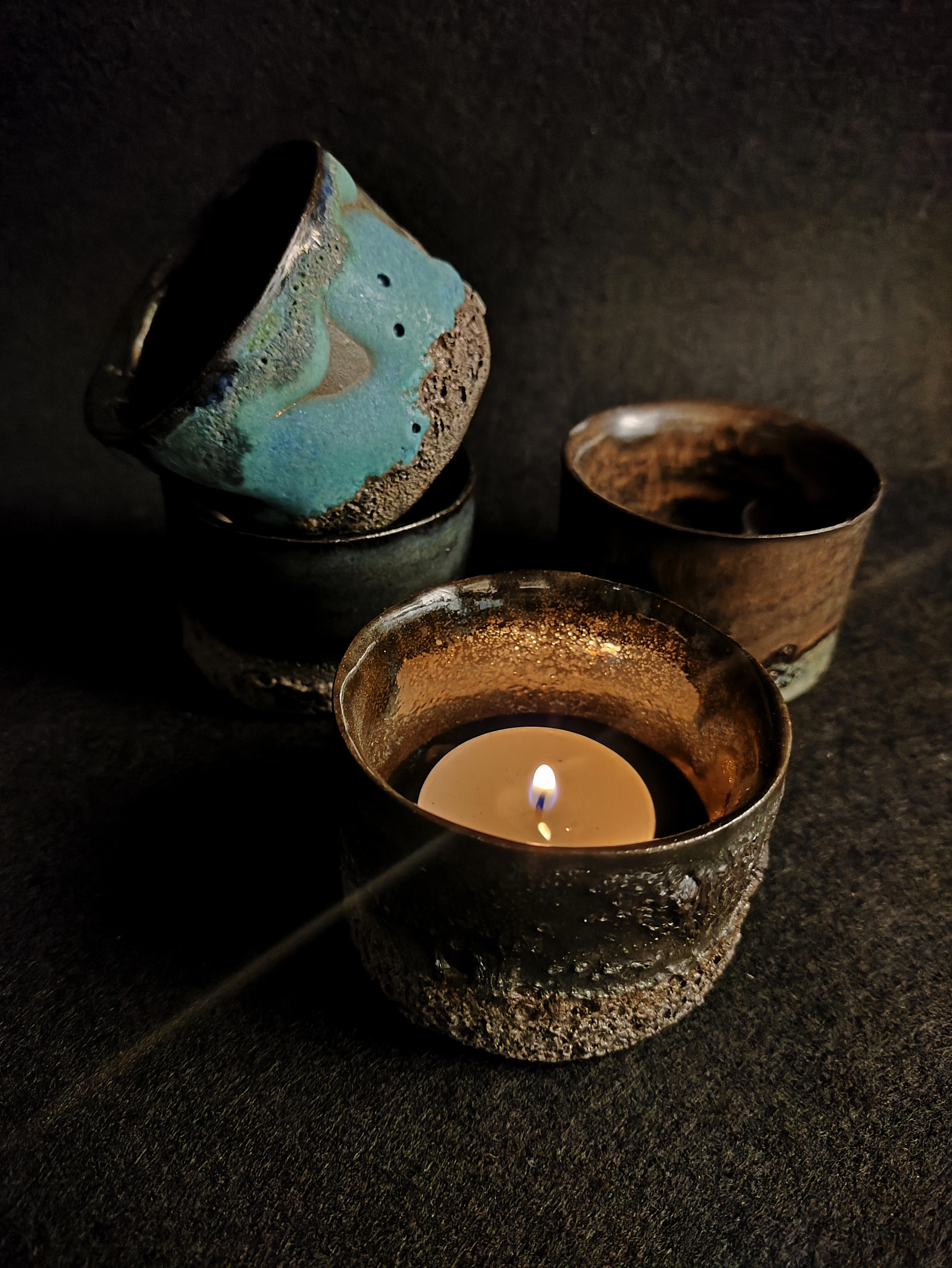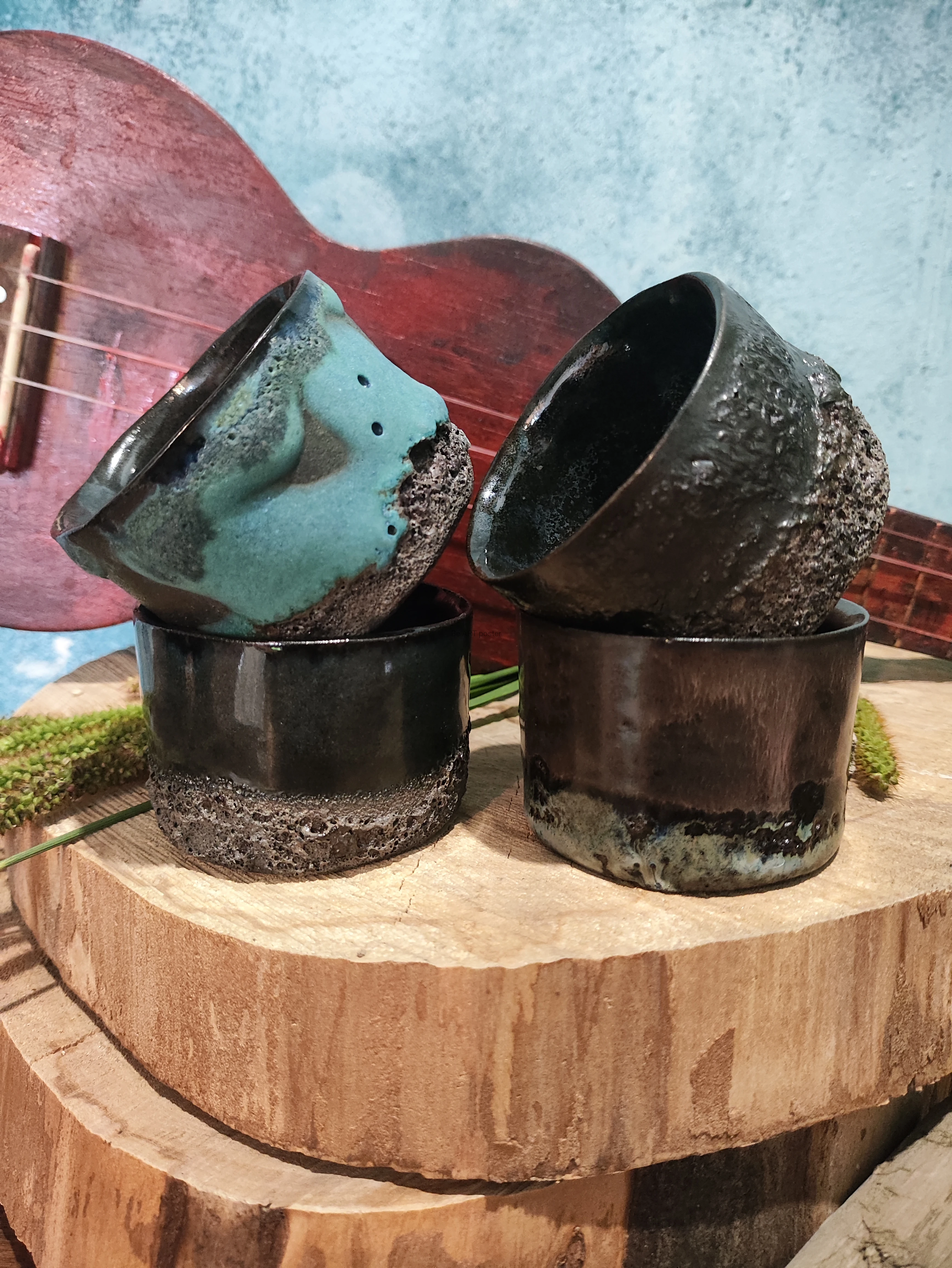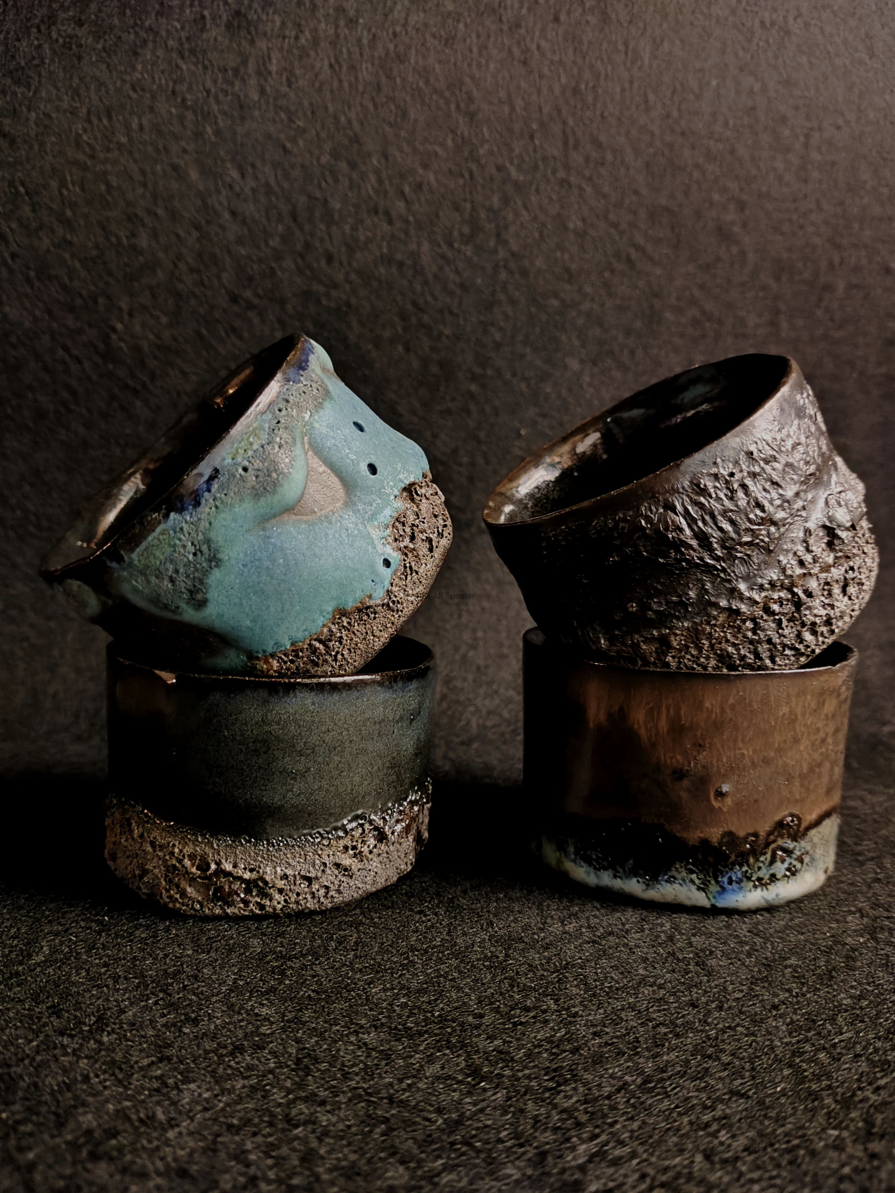 Ten ręcznie wykonany zestaw czterech ceramicznych kubków/miseczek o pojemności 100 ml łączy funkcjonalność z artystycznym wyrazem. Surowa, przypominająca kamień faktura i nieregularne szkliwienie sprawiają, że każdy element jest niepowtarzalny – idealny do codziennych rytuałów: od serwowania sosów i dipów, przez degustację napojów, po tworzenie przytulnej atmosfery jako świeczniki na podgrzewacze.