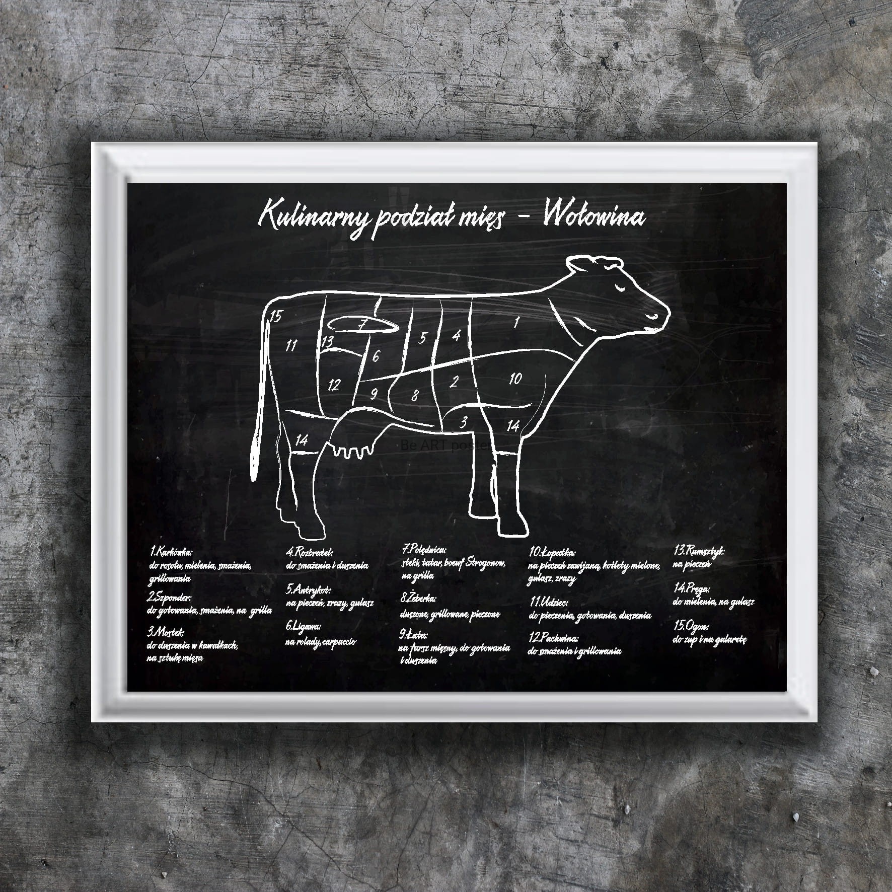 Plakat z autorską grafiką: kreda - podział mięsa - wołowina