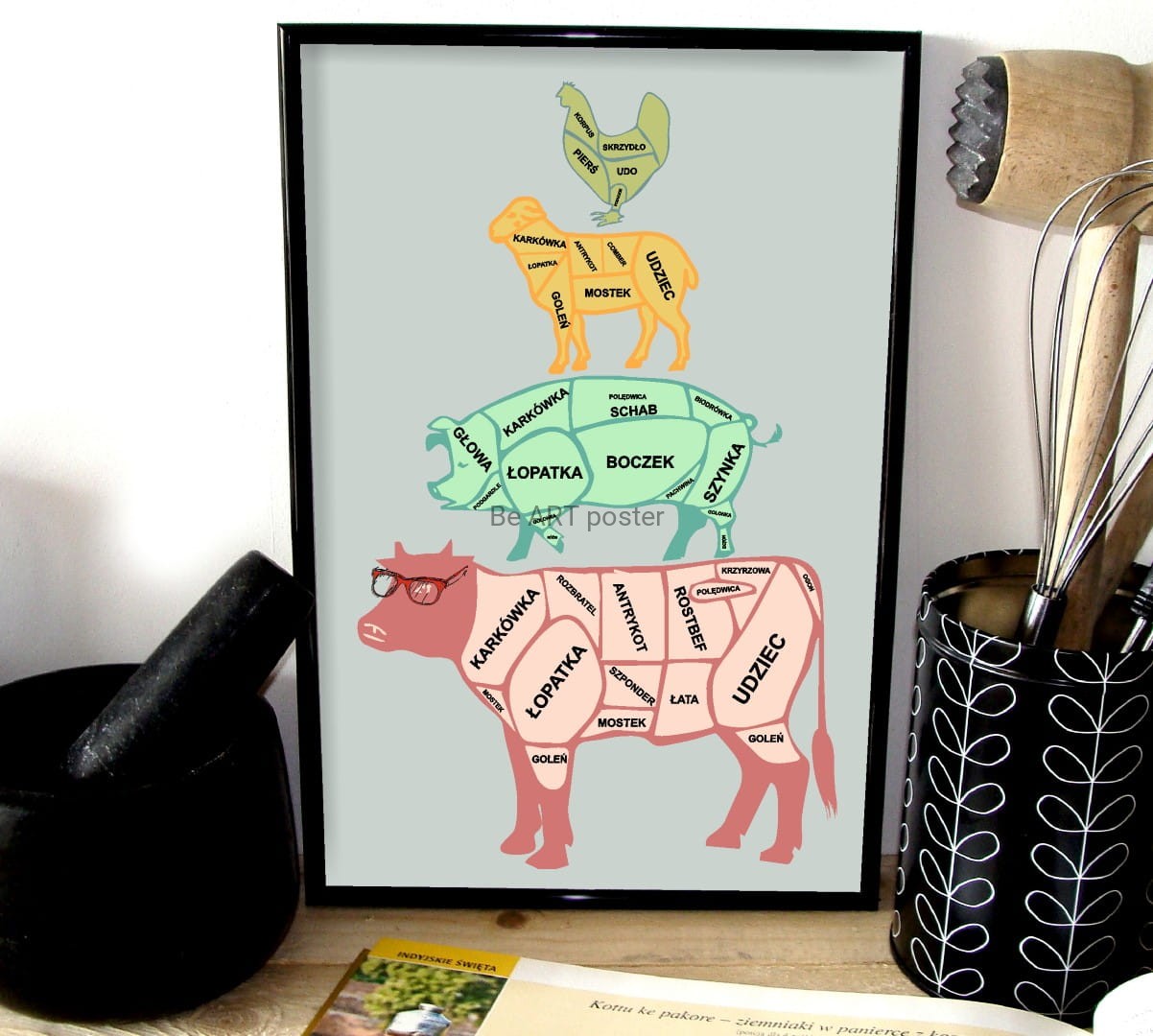 Plakat z autorską grafiką: podział mięsa - pop